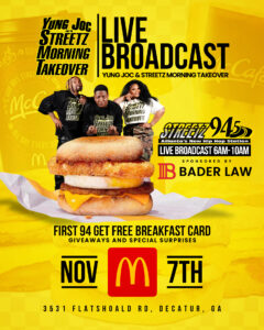 Streetz 94.5 FM is bringing the Yung Joc & Streetz Morning Takeover to McDonald’s for a special LIVE broadcast on Thursday, November 7th from 6AM–10AM at 3531 Flat Shoals Rd, Decatur, GA!
