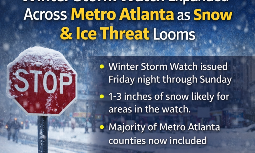 A Winter Storm Watch has been expanded to include numerous Metro Atlanta counties as the region prepares for a significant winter weather event this weekend, bringing the likelihood of accumulating snow and hazardous travel conditions.