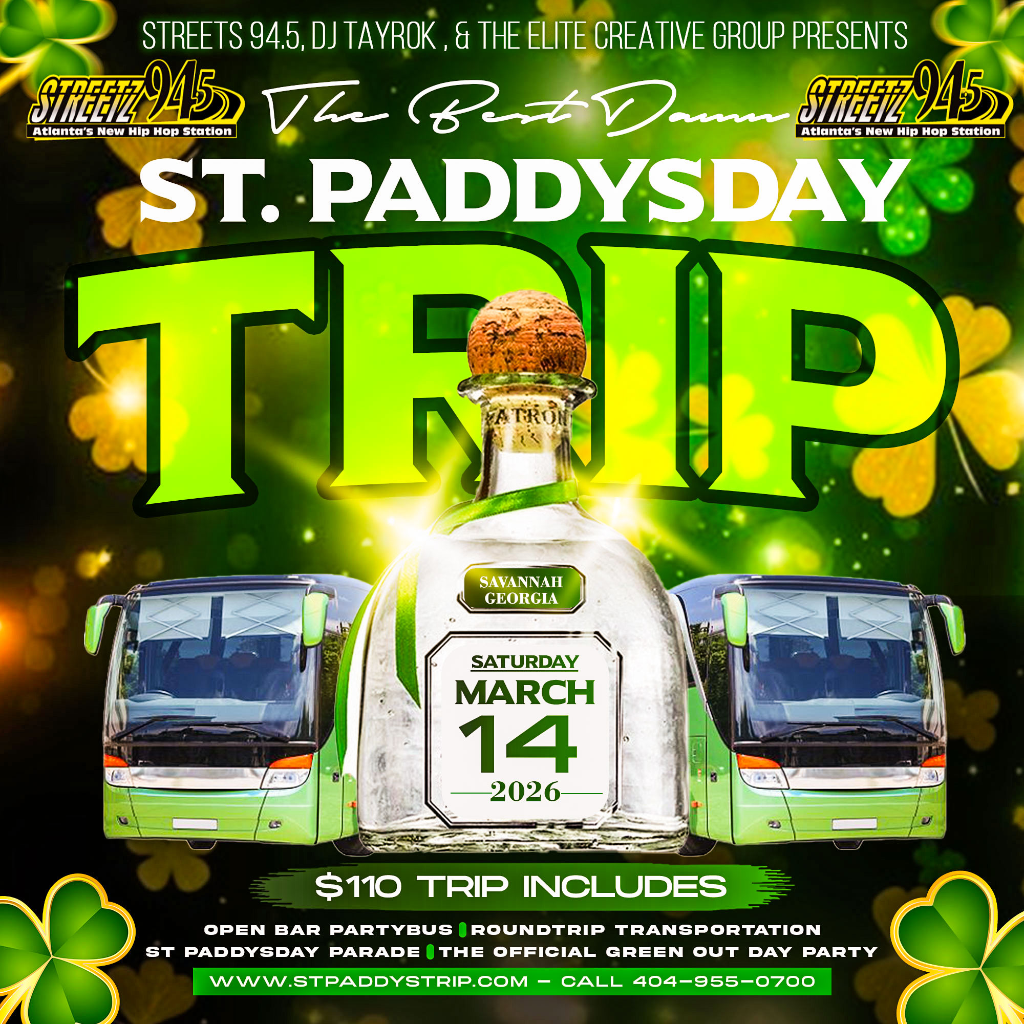 Get ready to turn all the way up for St. Patrick’s Day weekend as Streetz 94.5, DJ Tayrok, and The Elite Creative Group present “The Best Damn St. Paddy’s Day Trip” — an unforgettable party experience in Savannah, Georgia.
